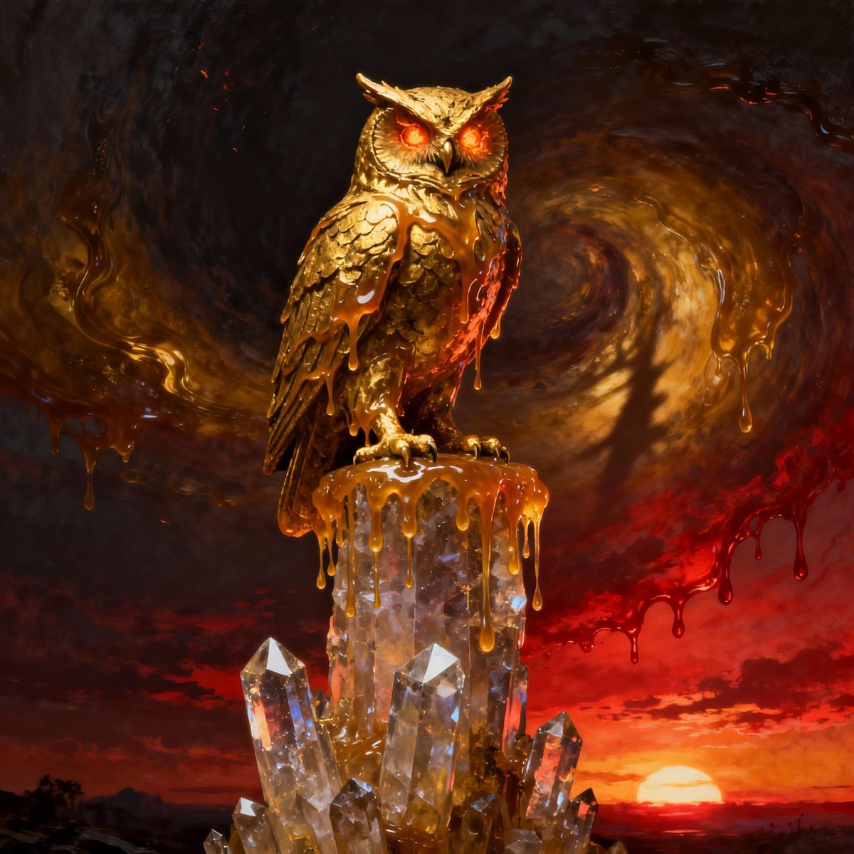 A majestic owl made of flowing gold, with ember eyes, sits on a honey-like crystal tower. Dark fantasy art with liquid textures and fiery colors.