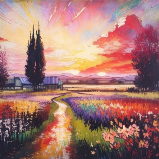 A vibrant encaustic spring landscape with a chaotic sunset. The image evokes Van Gogh's post-impressionist style with alcohol ink techniques and a golden ratio composition.