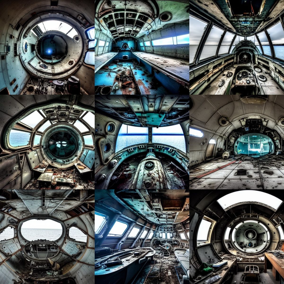 This image shows the interior of a derelict, high-tech submarine. The vessel appears to be damaged and floating on the surface, implying a catastrophic event.