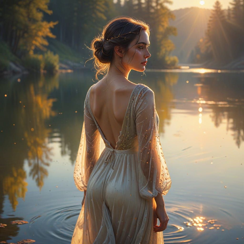This image captures a woman by a serene lake, depicted in a vibrant oil painting style with gentle, watercolor-like color blending and delicate strokes.