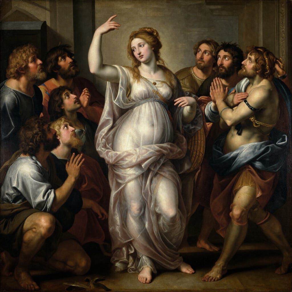 This ancient painting depicts a beautiful, confident woman in flowing garments, admired by a crowd. It features rich colors and dramatic chiaroscuro lighting, in the style of Renaissance and Baroque art.