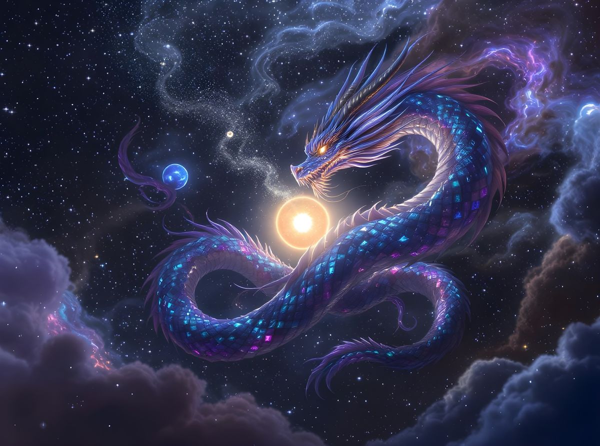 A celestial dragon coiled around a binary star system, its scales shimmering with the colors of distant galaxies, exhaling cosmic dust that forms new nebulae. The dragon's eyes glow with ancient wisdom, and its presence radiates a sense of cosmic balance and power. Hyperrealistic, splash art, concept ...