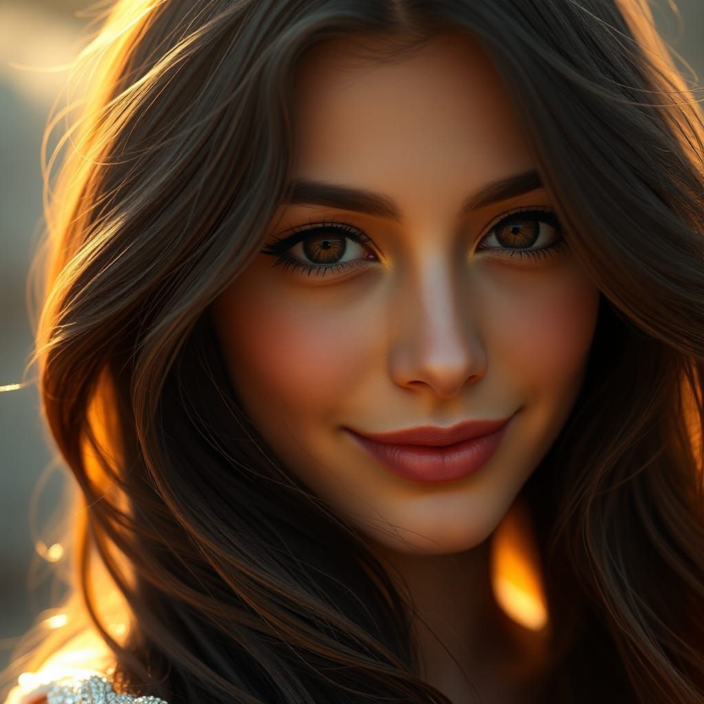 A stunning portrait of a young woman with flowing dark hair and captivating brown eyes. The soft lighting and blurred background create a warm, inviting atmosphere in this digital art piece.