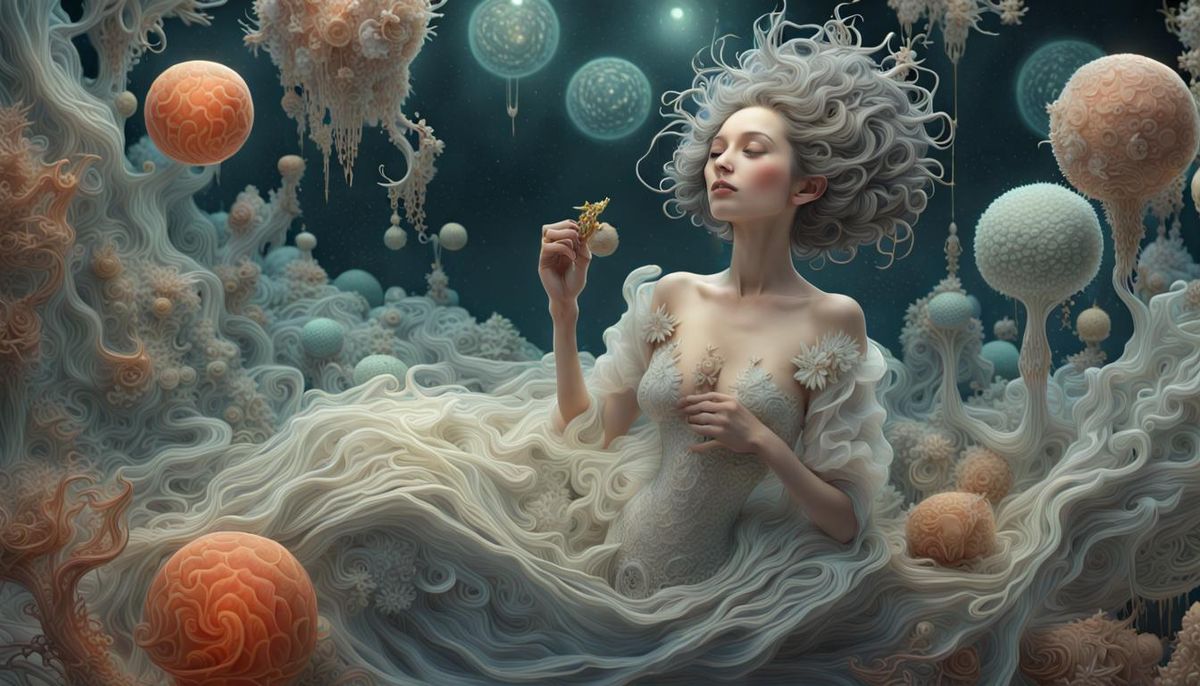 A digital painting of figures in a weightless, simulated environment. The detailed image features rich colors and intricate carvings reminiscent of oil on ceramic with visible brush strokes, in a surrealist style.