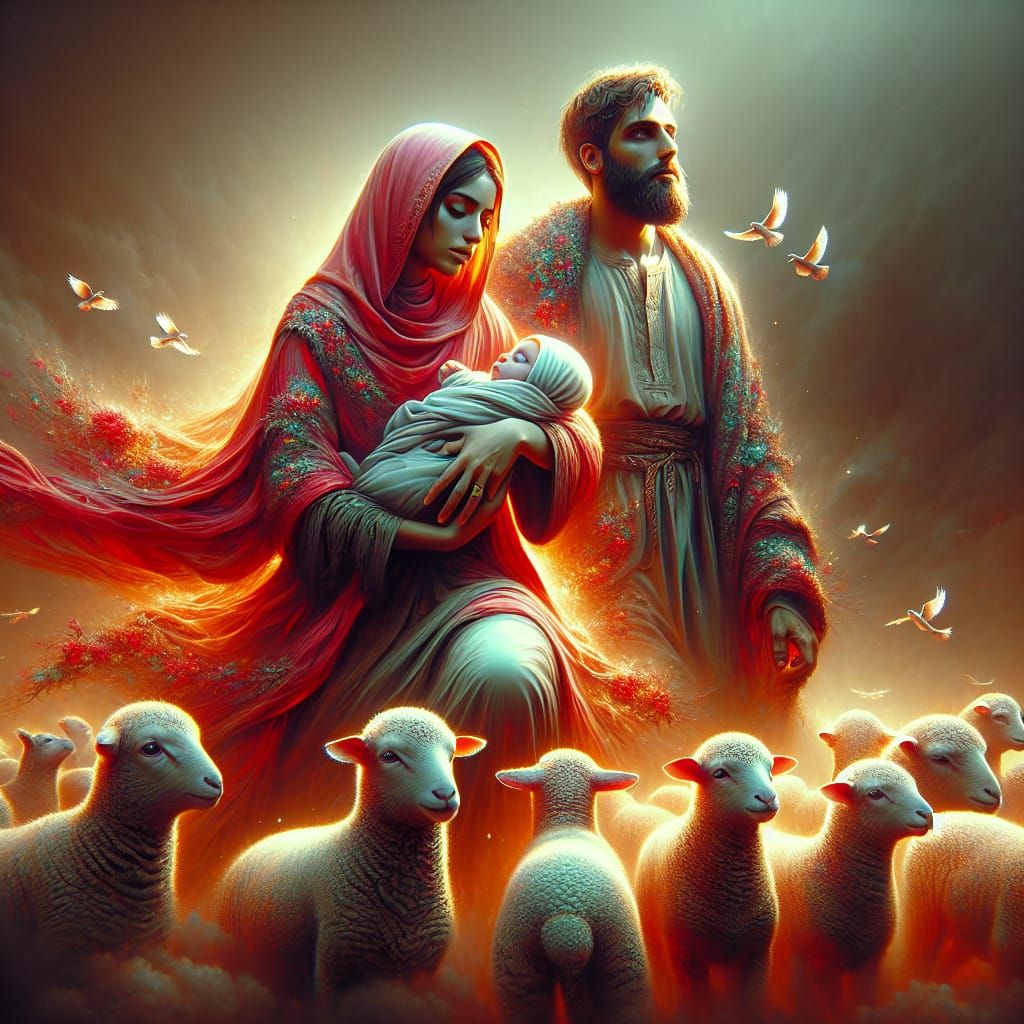 This image showcases a hyper-realistic scene of a woman holding a baby, with a man and sheep nearby. It features sharp, bright colors and a detailed matte painting aesthetic, evoking a fantasy concept.