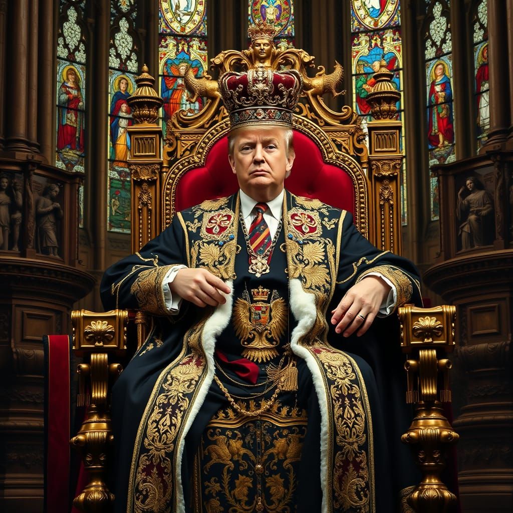 This image depicts a regal Donald Trump, seated upon a lavish throne, proclaiming his sovereignty over various realms, surrounded by Gothic-inspired architecture and ornate details reminiscent of Hans Holbein the Younger and Ash Thorp