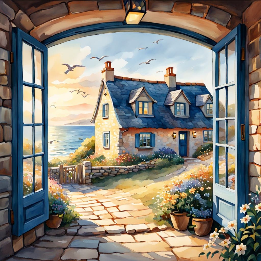 This image shows a watercolor painting of a quaint cottage with blue accents, perched by the sea. The soft impressionistic style and golden hour lighting create a serene and idyllic scene.
