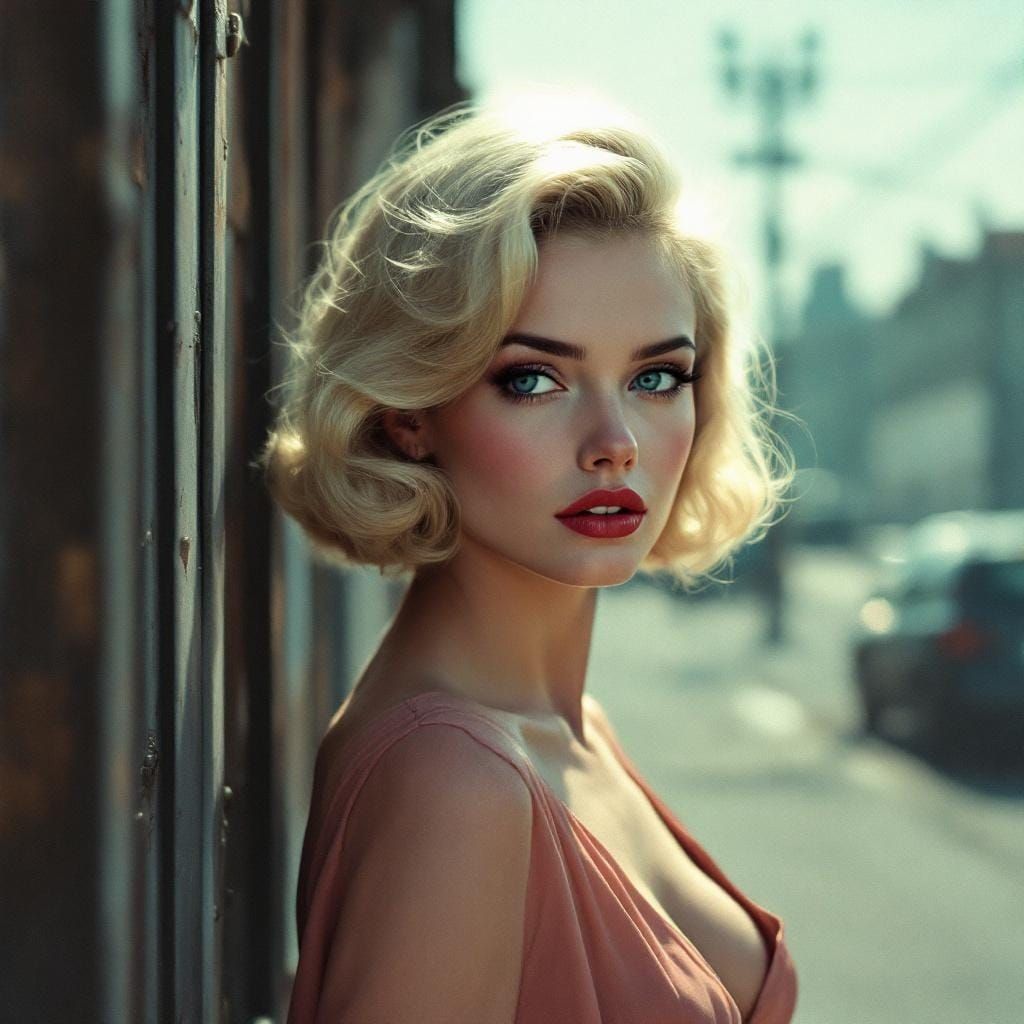 A melancholic image of a 1950s pin-up woman with bold eye contact, standing in a hazy, atmospheric landscape. The artwork features digital painting with gestural figures and expressive brushwork.