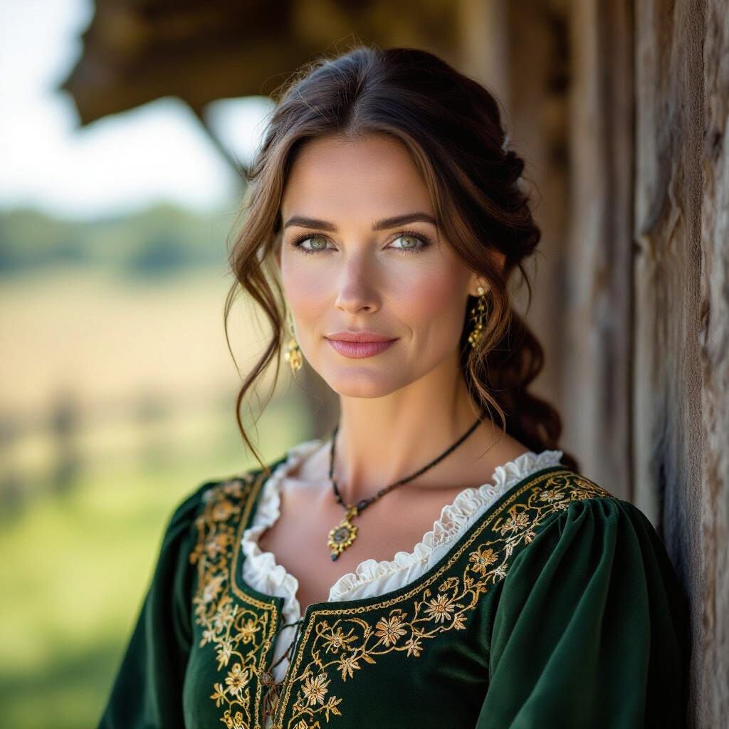 This image depicts a middle-aged female seneschal in medieval attire, featuring dark green robes with gold embroidery. The portrait, set in a rustic scene, employs soft lighting and a sharp focus.