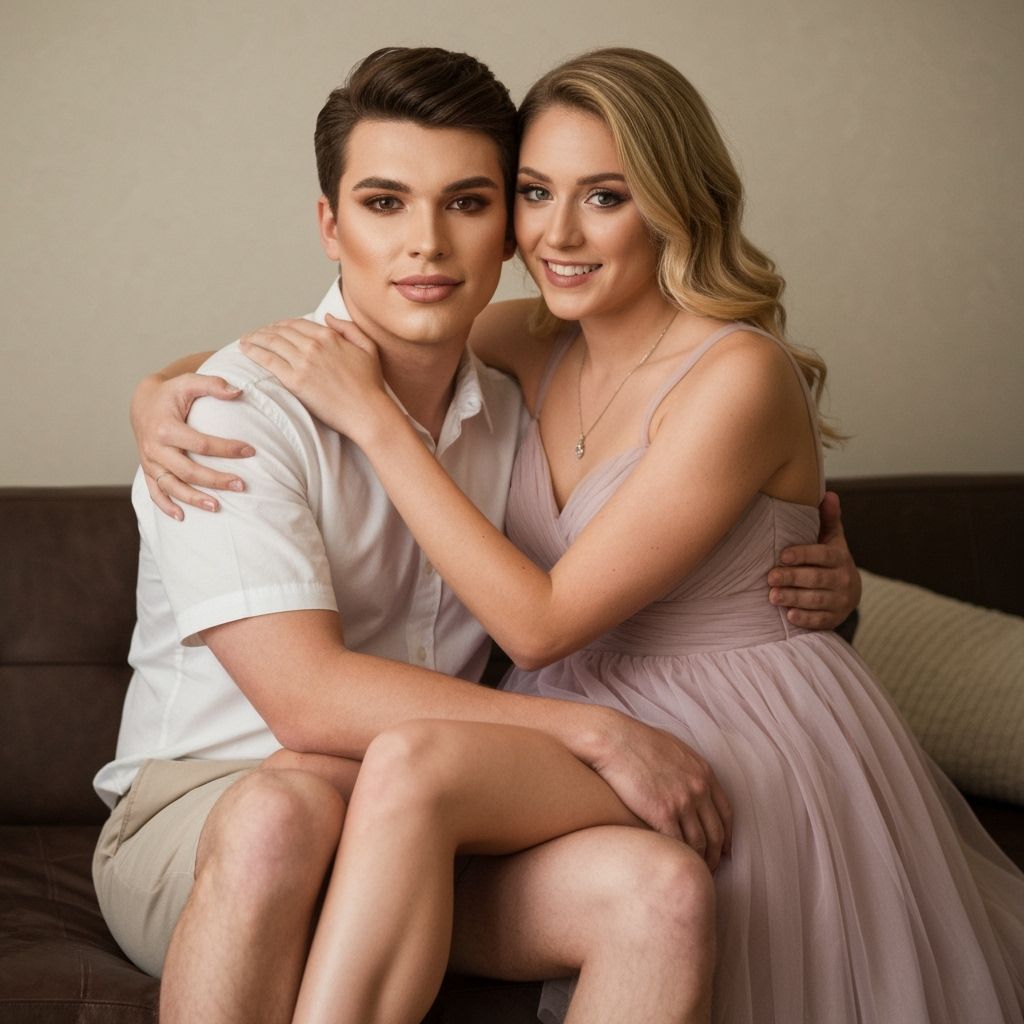 This image depicts a charming young man in light makeup, crossdressing in a short, A-line tulle bridesmaid dress. He is seated on a woman's lap in a cozy indoor setting with soft lighting.