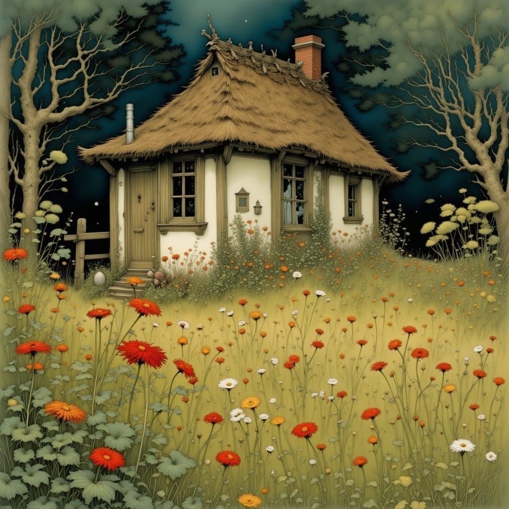 This image is a captivating depiction of a serene garden with vibrant wildflowers and a charming cottage, reminiscent of the enchanting illustrations found in classic children's literature, created in a style that blends fantasy and nostalgia.
