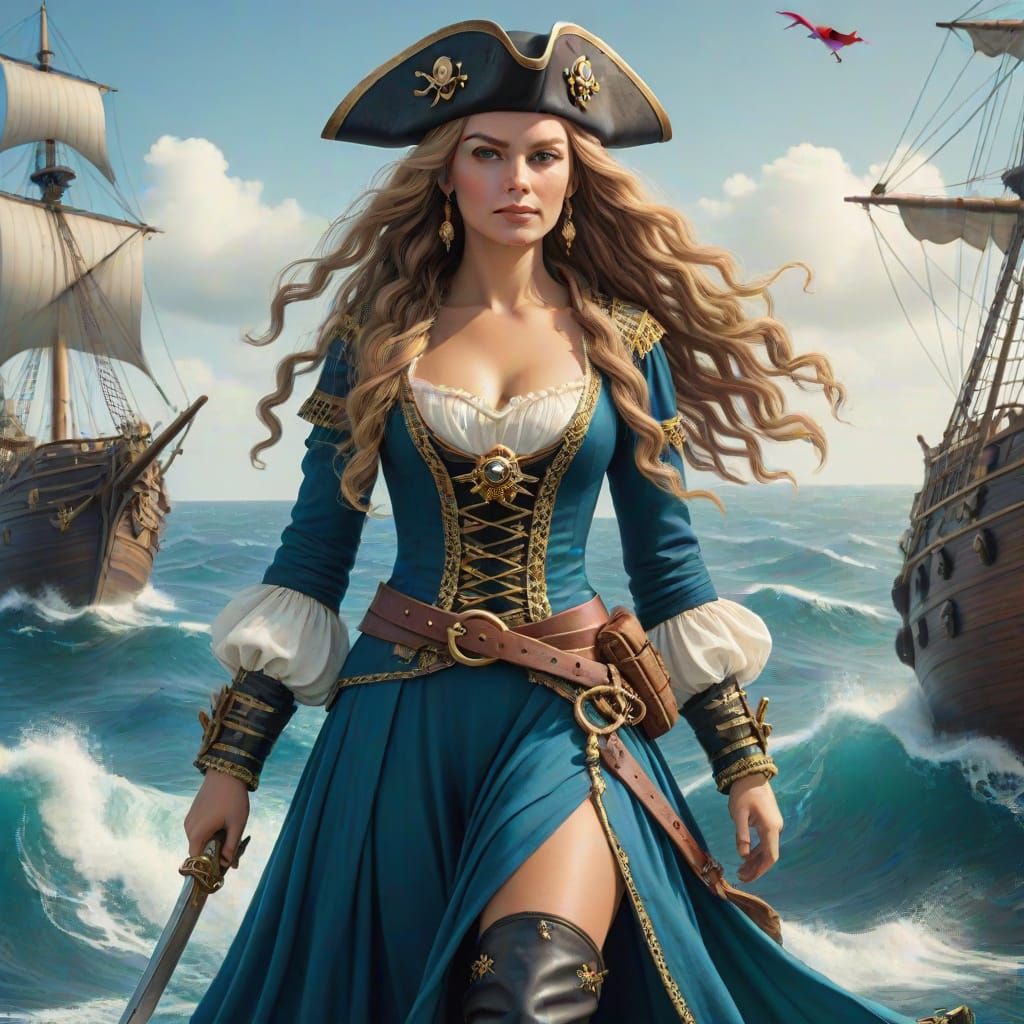 Easily generate stunning pirate queen images with our free AI image maker, featuring beautiful dresses and majestic hair