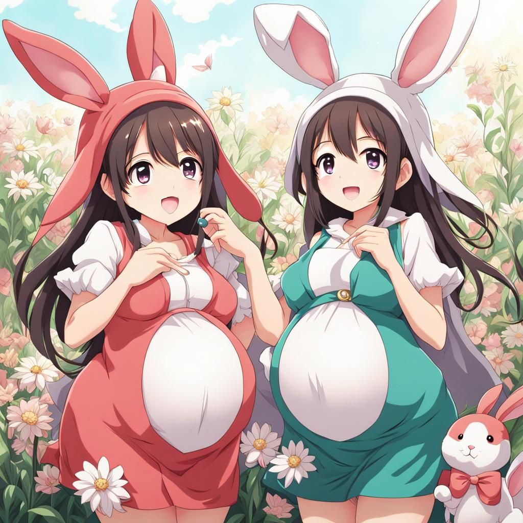 This image features anime-style women in bunny costumes. The artwork has a manga aesthetic, reminiscent of key visual art with a Japanese anime style.