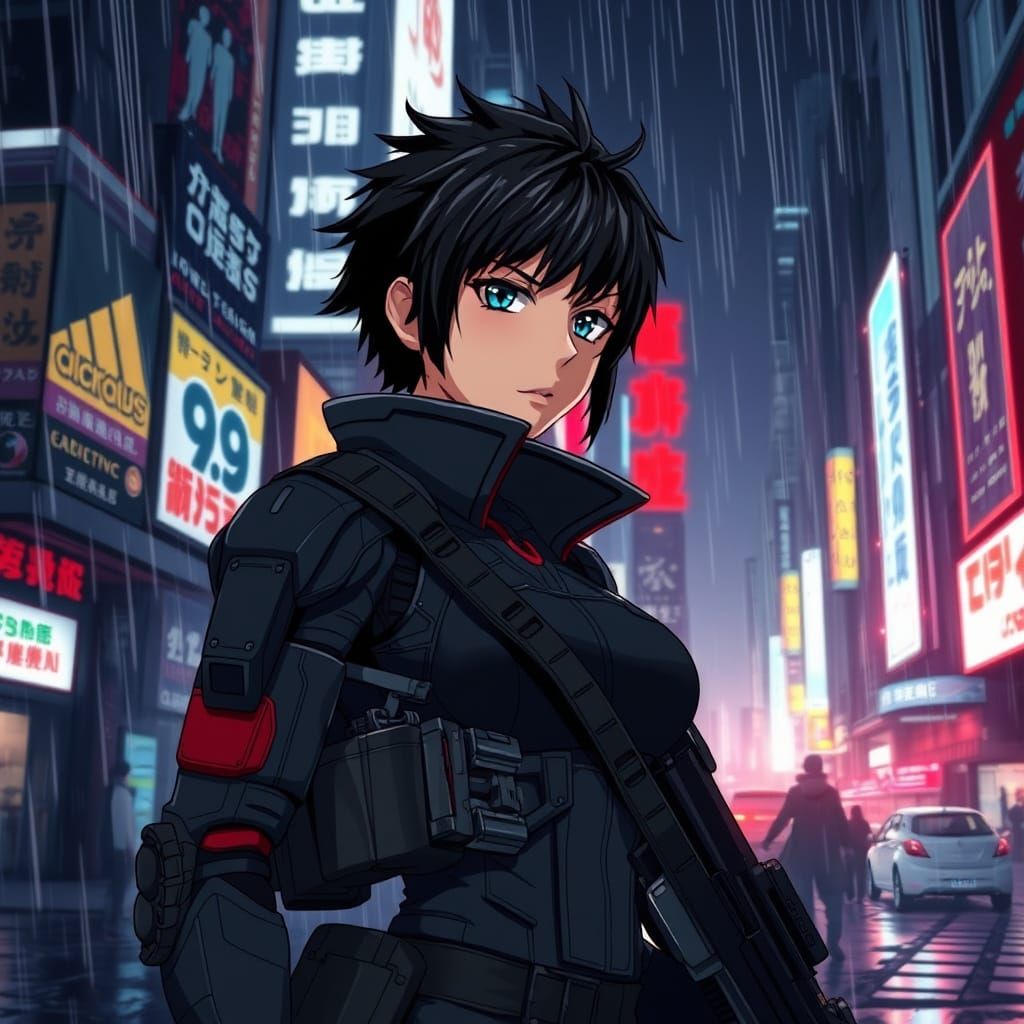 This image shows a stoic female anime soldier in a futuristic suit standing in a war-torn, neon-lit city at night. Rain reflects the glow of advertisements, with dramatic lighting.