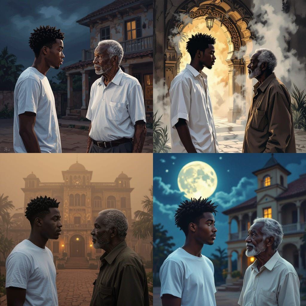 This image shows a young man in a white shirt speaking with an older man outside an ancient, mysterious African hotel at midnight. The scene features hyperrealistic detail and dramatic lighting.