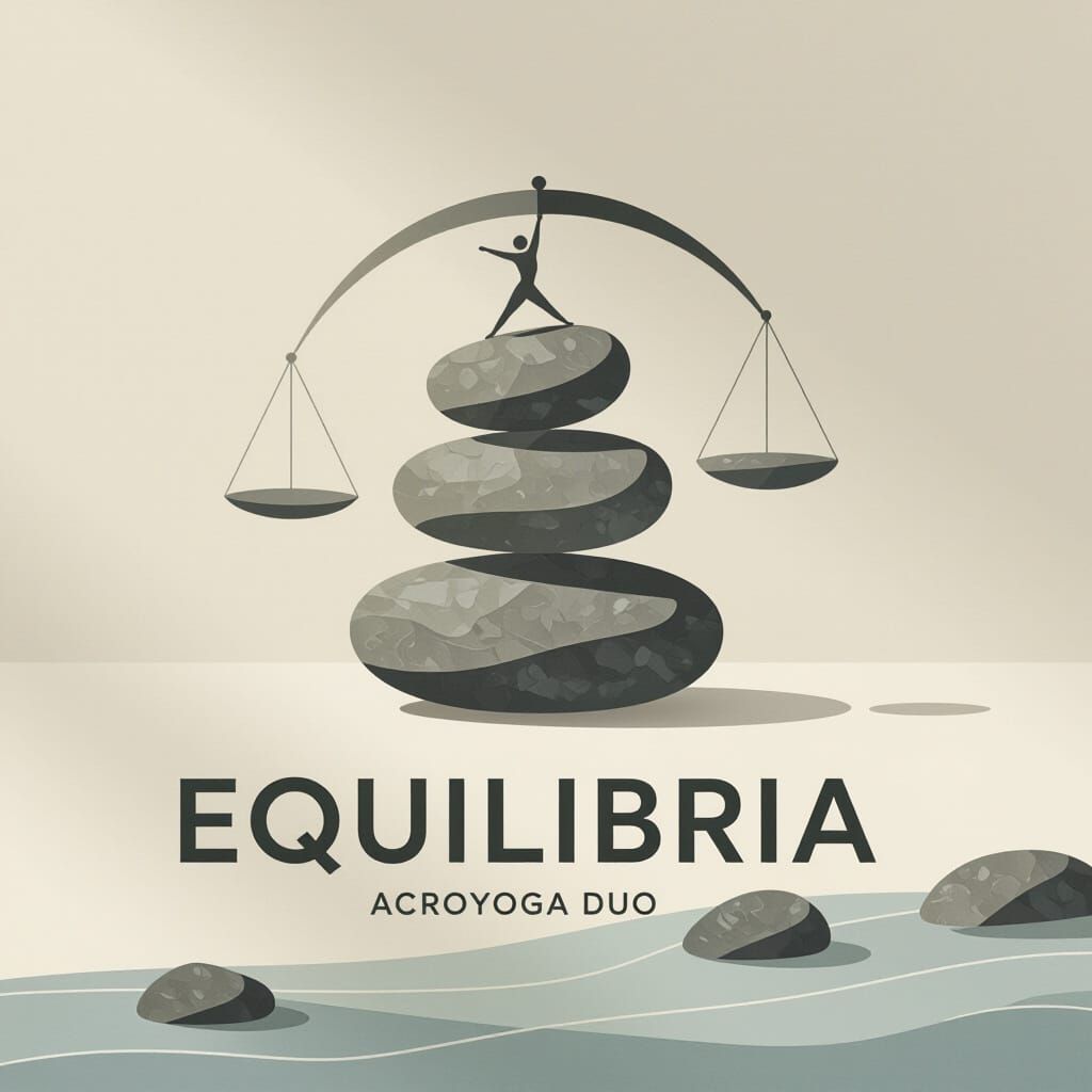 This image features a minimalist, clean line art logo for Equilibria acroyoga. It depicts stones in precarious balance, with subtle gradients and soft lighting, evoking harmony. Inspired by flowing, balanced artistic styles.