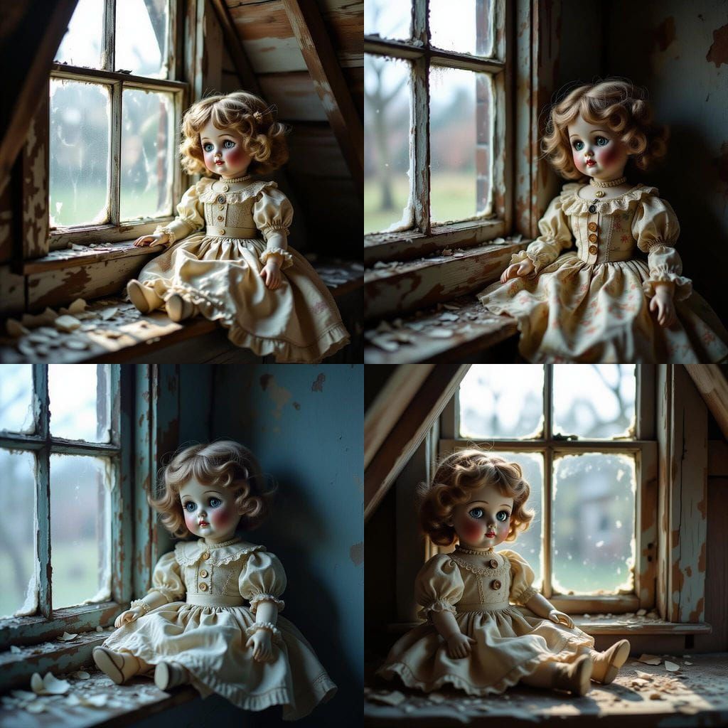 This image shows a detailed vintage porcelain doll on a dusty attic shelf, illuminated by moonlight. Rendered in a nostalgic, storybook style with cinematic lighting and mixed media textures, it evokes forgotten childhood memories.