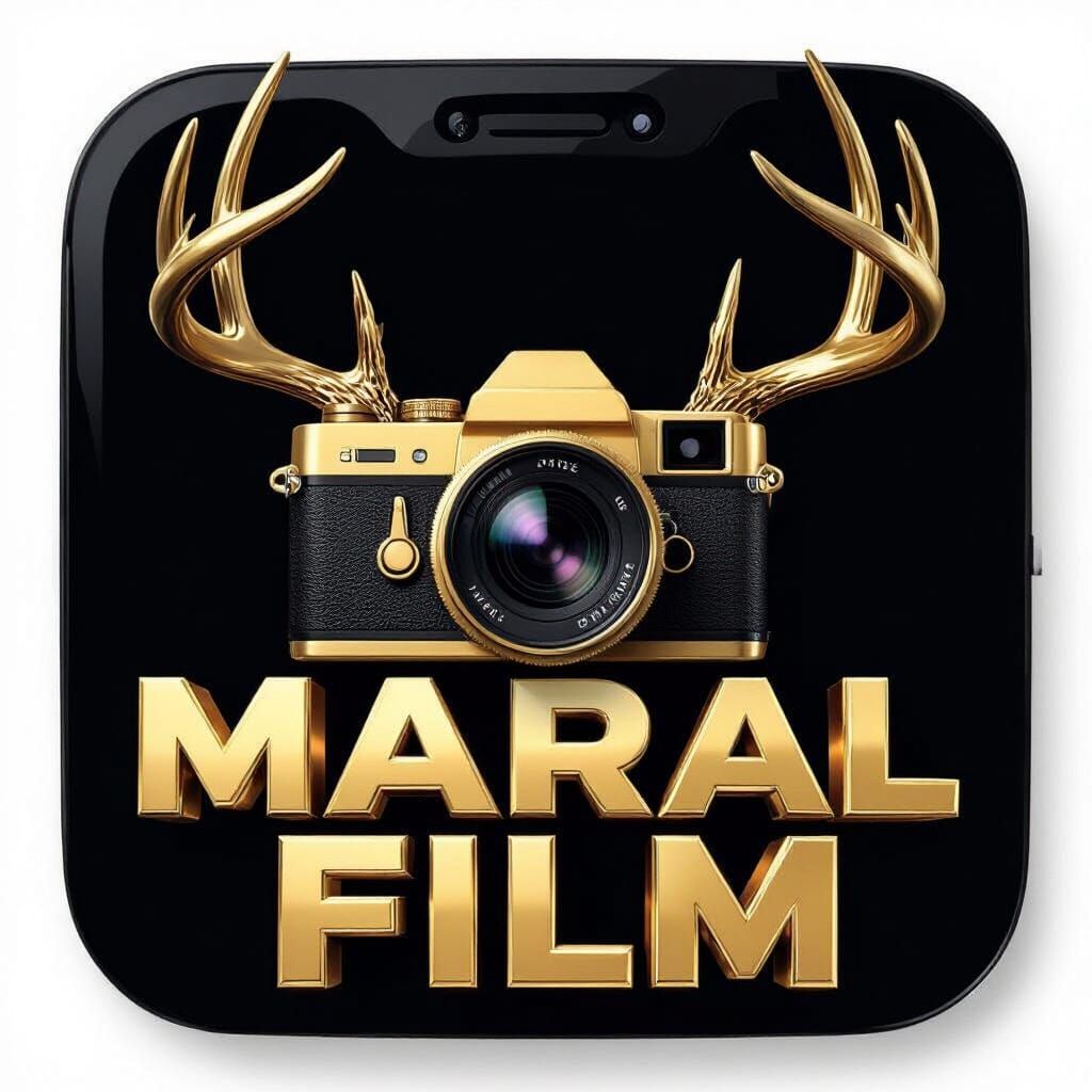 This image shows a 3D render of an Instagram logo featuring a professional camera, accented by glossy gold deer antlers. The text "MARAL FILM" is integrated into the design with cinematic lighting and metallic reflections.