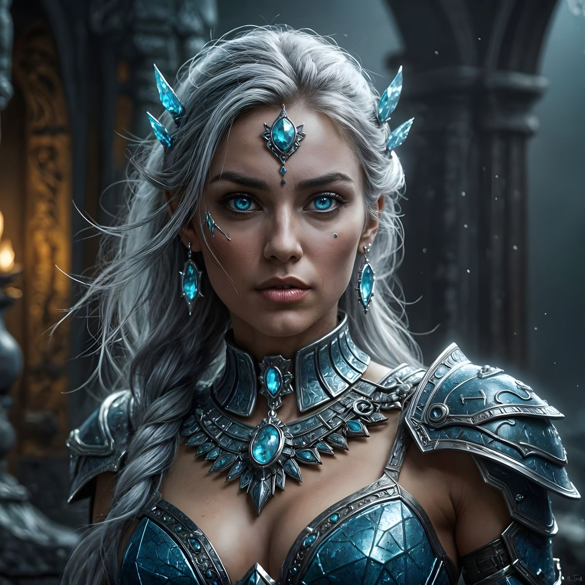 This image depicts a powerful female goddess in an epic fantasy setting, surrounded by blue sacred energy and turquoise gem armor. Her long white hair and blue eyes stand out against the intricate details and vivid colors of the scene, creating a moody and atmospheric atmosphere.