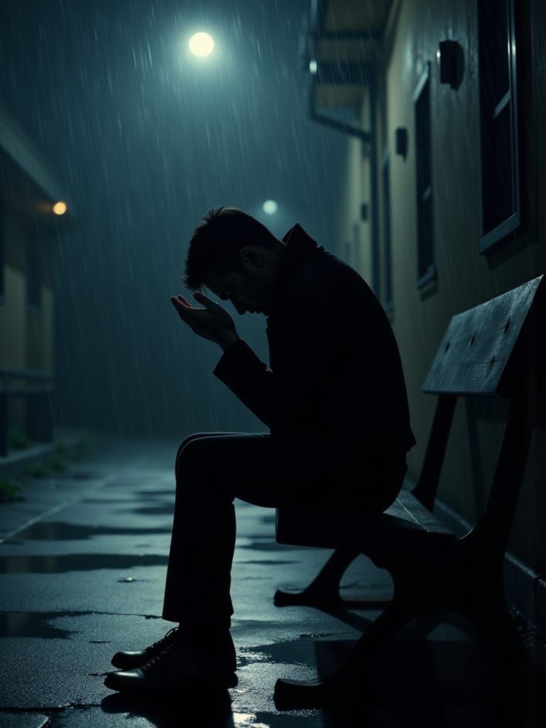 This image depicts a solitary man in deep distress on a wet park bench during a rainstorm. His posture conveys intense emotions, capturing a moment of vulnerability.