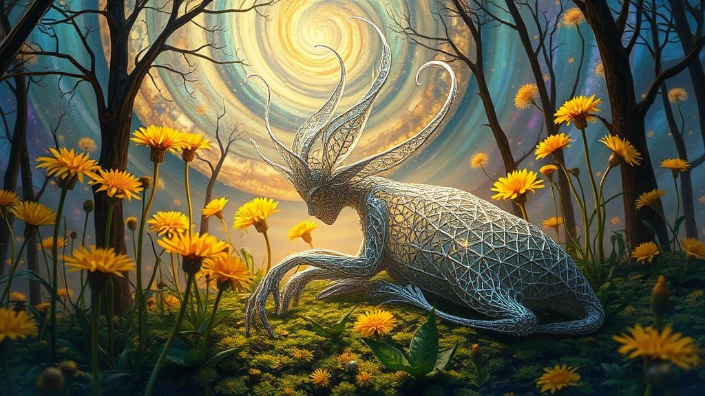 A surreal image of a resting prince made of silver filigree, glowing with iridescence. Ethereal creatures and dandelions surround him in a bio-art style, featuring transhumanist elements and mystical symbolism.