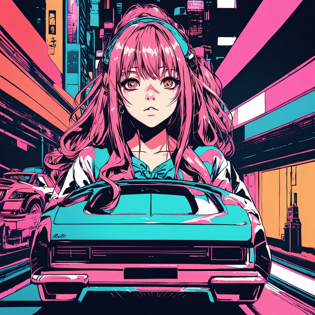 A stunning, flat composition of a gyaru girl leaning on a car, set against a deep blue and pink Tokyo sunset background, with bold lines and vibrant neon colors reflecting off the car's surface.