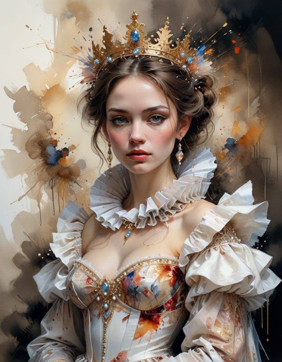 This image shows a regal queen in Renaissance attire, emulated as an oil painting. The artwork uses chiaroscuro techniques and expressive watercolour stylization to create a mesmerizing fusion.