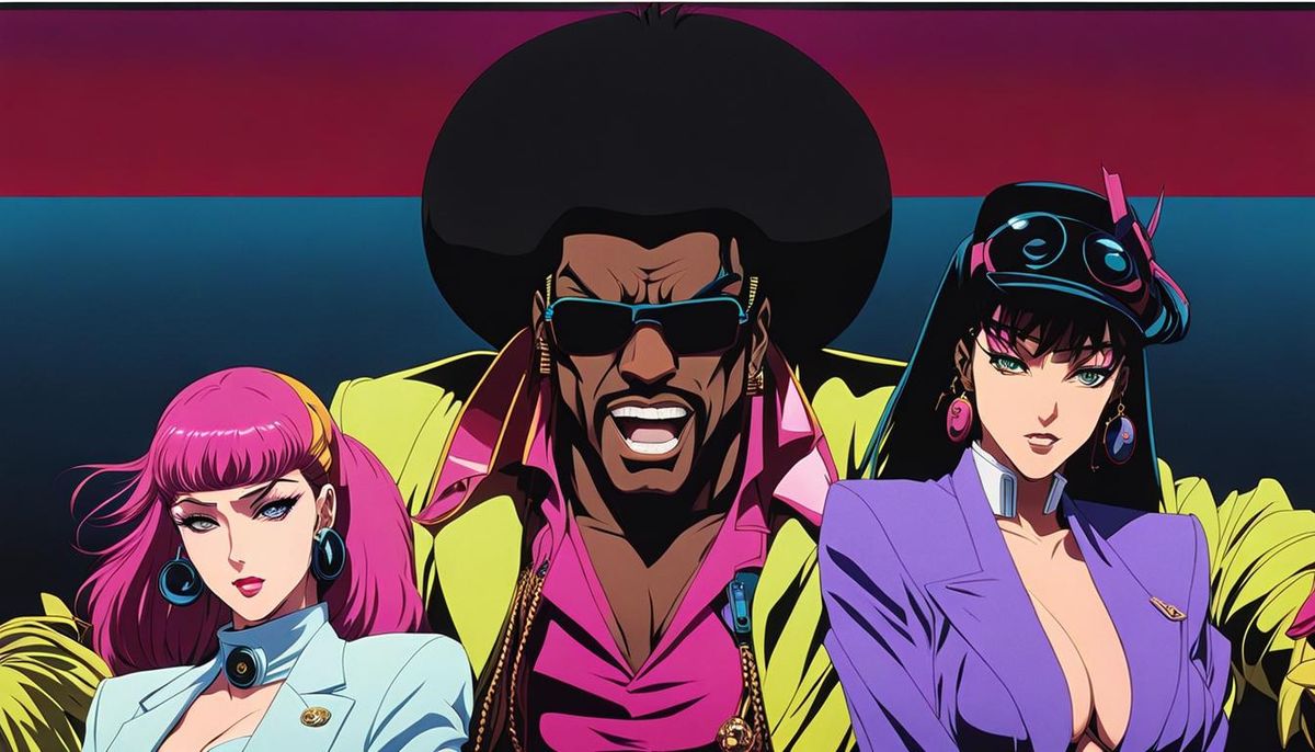 This image shows a cyberpunk character with two women, rendered in an 80s anime aesthetic. The composition features neon colors and fine details reminiscent of Japanese manga art.