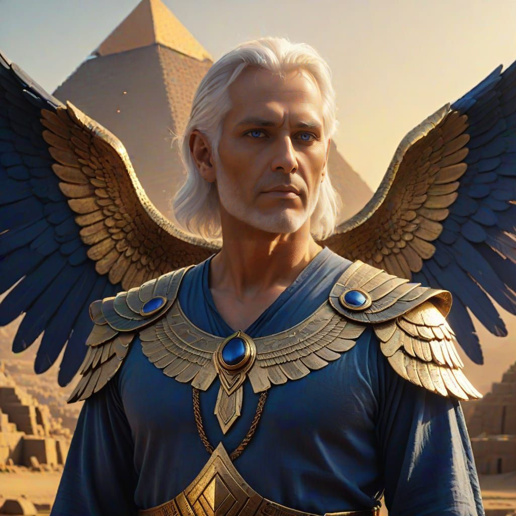 This image shows a realistic full portrait of the archangel Raziel, depicted as a mystical warrior with white hair and silver eyes. He has indigo trimmed wings, a gold trimmed tunic, brown pants, and boots, standing before the pyramids of Egypt.