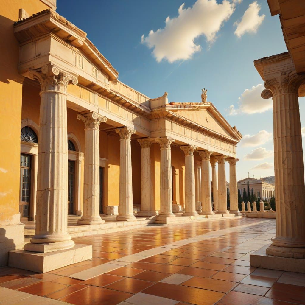 This image shows a grand ancient Greek cityscape bathed in warm golden hour light. Features a majestic golden-yellow neoclassical building with ionic columns, rendered in an oil painting style with soft stone textures.