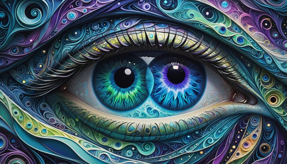 A surreal image of a giant eye in the sky with the Earth as its pupil. Aurora Borealis colors and fractal patterns create a mesmerizing, detailed scene with a space age fantasy aesthetic.