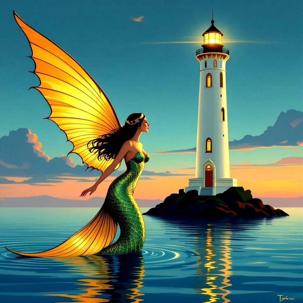 This image shows a majestic, stylized mermaid with geometric fins and golden scales next to an art deco lighthouse. The scene captures a calm twilight sea with dramatic backlighting and bold colors.