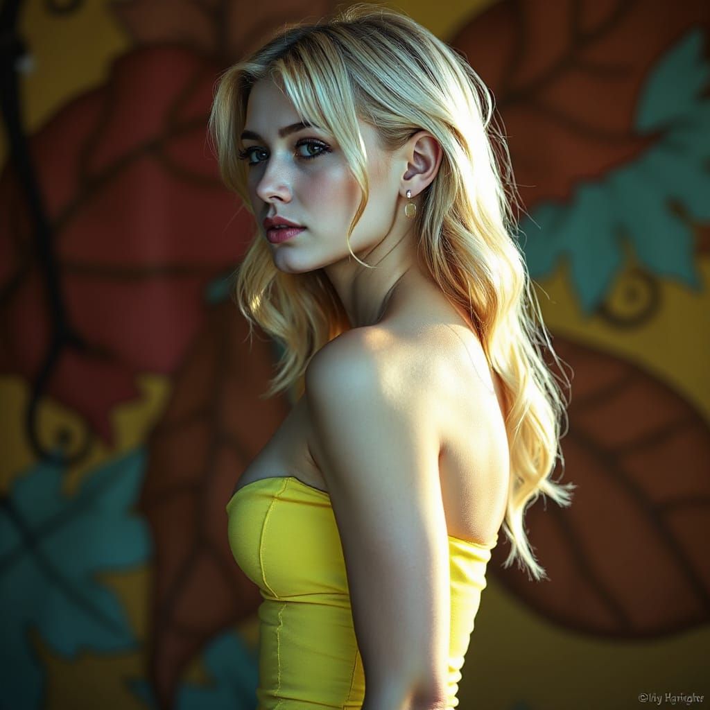A hyperrealistic image of a blonde weather fairy in a yellow dress. The side view and vivid colors create a striking portrait, reminiscent of digital art with intricate textures and dramatic lighting.