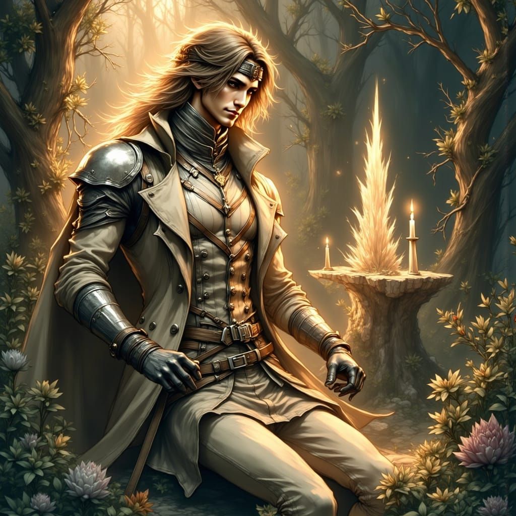 A celestial knight with flowing hair and piercing eyes kneels before an altar in a hidden grove. The image features glowing crystals, otherworldly flora and shimmering stardust armor in an art nouveau style.