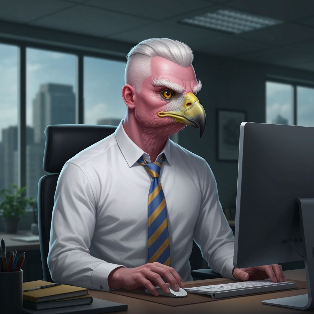 This striking image depicts a man with a hawk's head and human skin, dressed in a suit, working at a desk. Rendered as dark fantasy concept art with hyperdetailed elements and flowing lines.