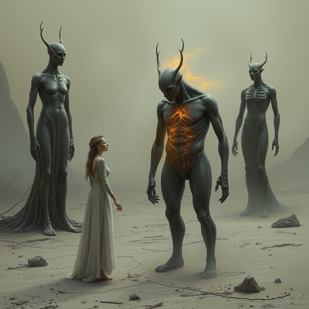This image depicts a healing moment in a desolate, ashy environment. Figures interact, with one emitting golden light, symbolizing connection and recovery. The art style is serene and dreamlike.