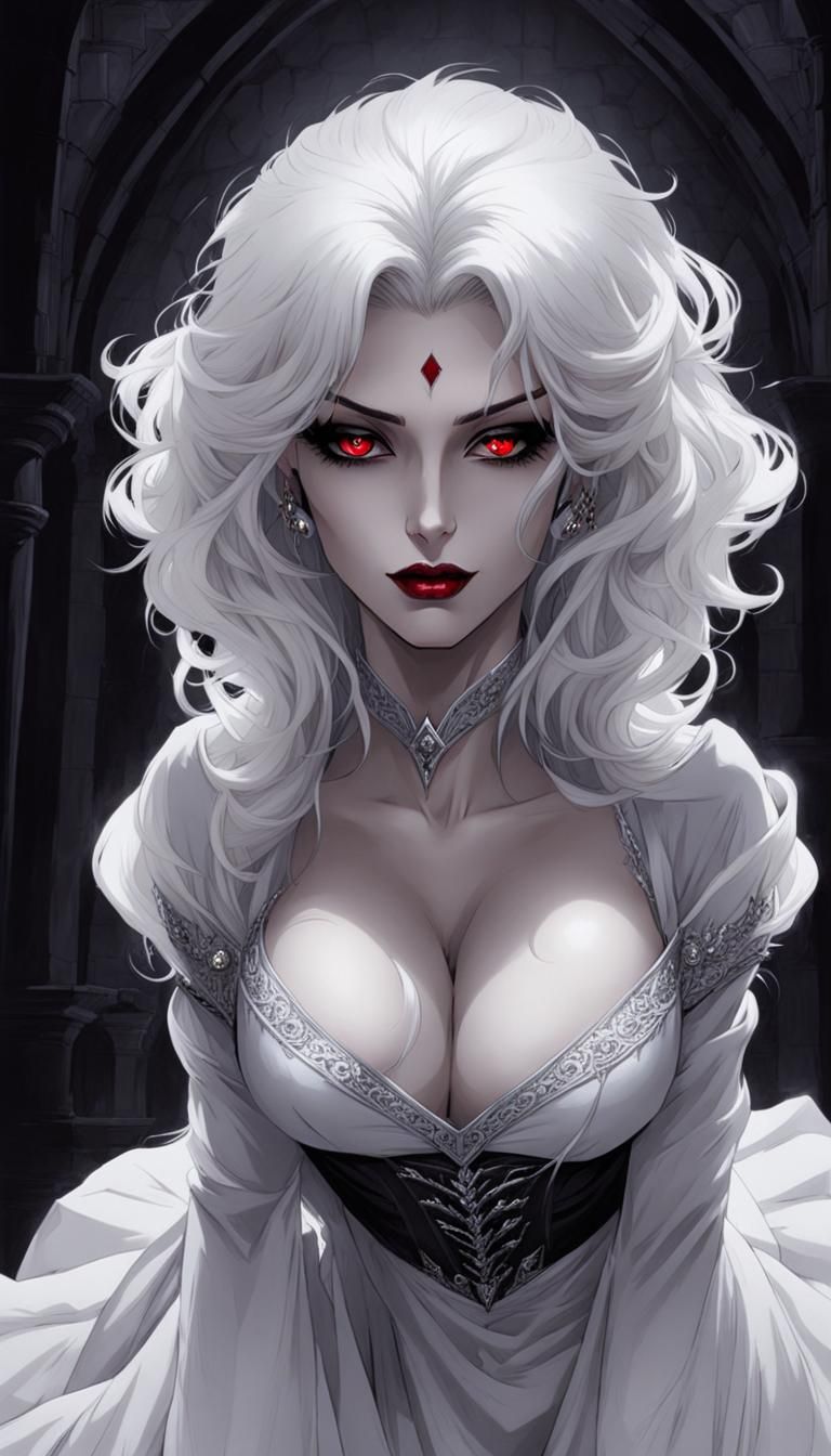 gorgeous white-haired vampire bent over, kneeling in dark gothic castle, close up, big breast, large bust, red eyes, pale complexion, white skin, hourglass figure, (dark fantasy art:1.5), (gothic art:2), (black ink comic:2), deep color, (high contrast:2), intricate details