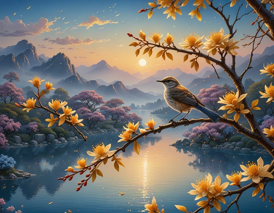 A beautiful nightingale perched on a blossoming branch above a lake. The landscape is hyperdetailed and misty, with soft golden light and warm colors in this idyllic scene.
