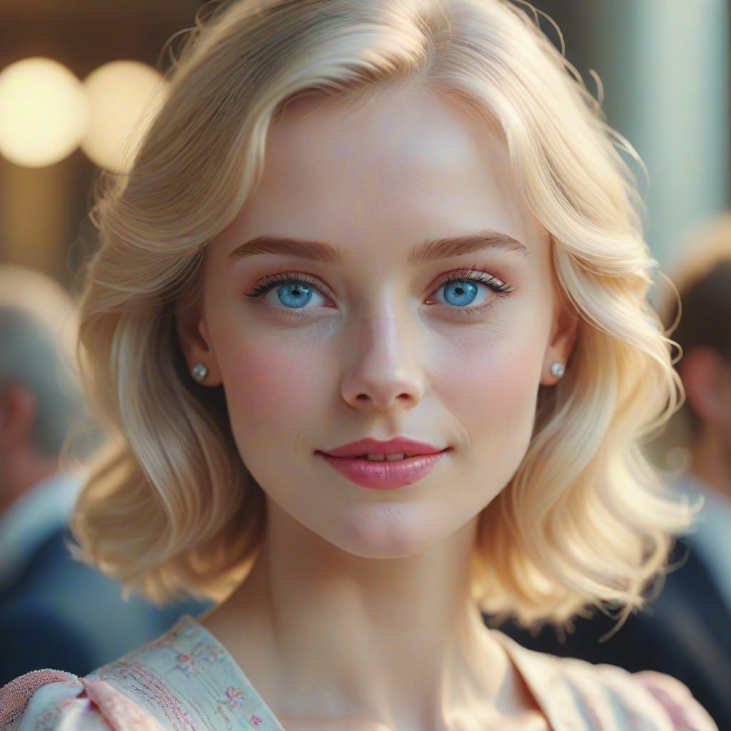 This image shows a close-up portrait of a beautiful blonde woman with blue eyes and delicate features. The soft focus, warm light, and pastel colors create a classic and elegant atmosphere.