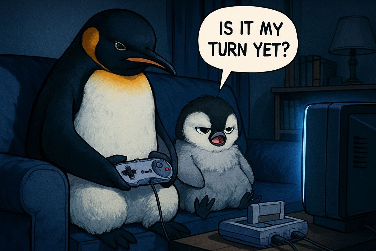 This image shows two penguins in a dimly lit living room, done in a detailed anime style. One penguin is playing a Super Nintendo on the couch, while the other, a fluffy chick, appears grumpy and demands its turn.