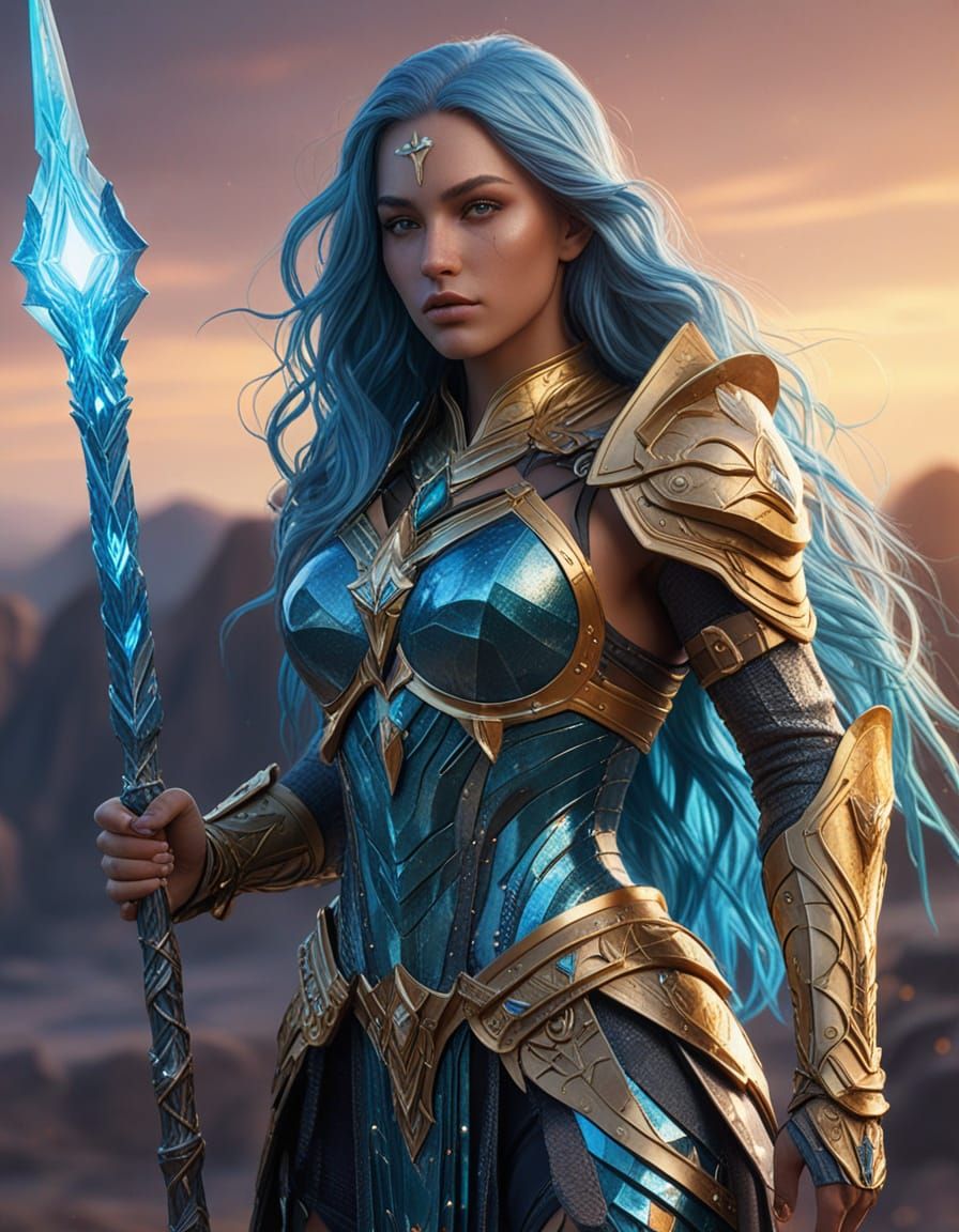 This image shows a female warrior in crystalline armor with flowing blue hair, holding a glowing spear. The composition features soft, warm lighting and complementary colors, rendered as hyper-realistic digital art.