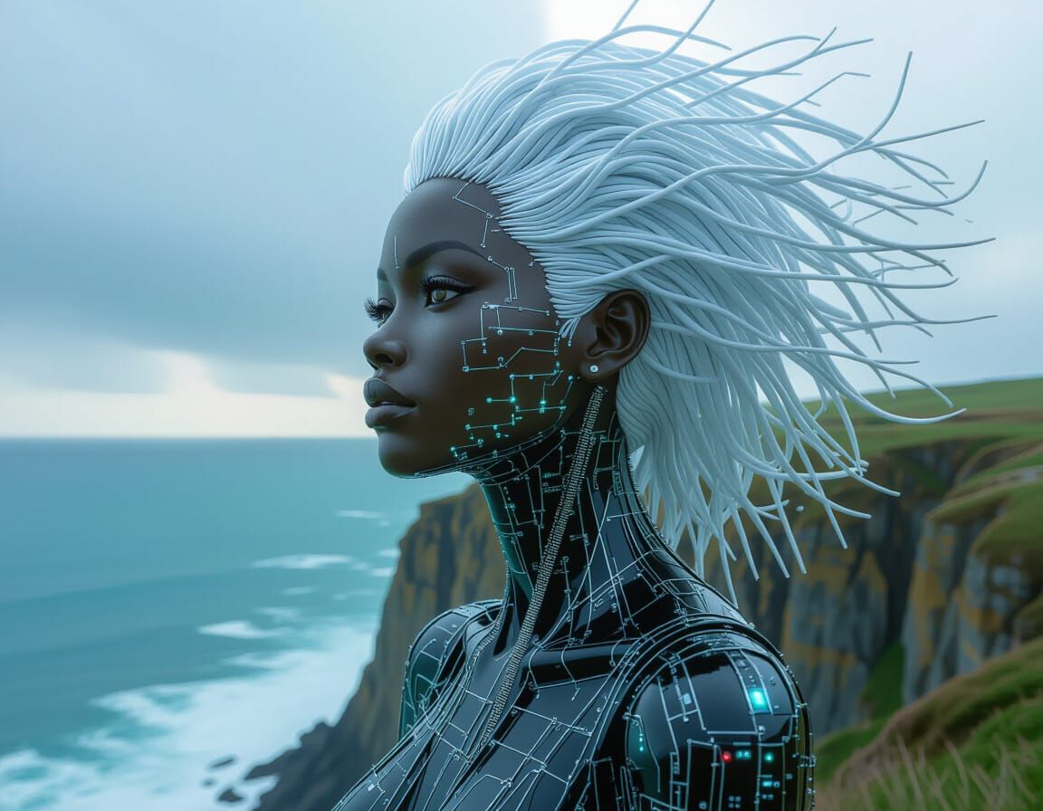 This image shows a hyperrealistic statue of an African woman with white hair overlooking a stormy sea. The statue is made of metal and circuits in a hyperrealistic art deco style.