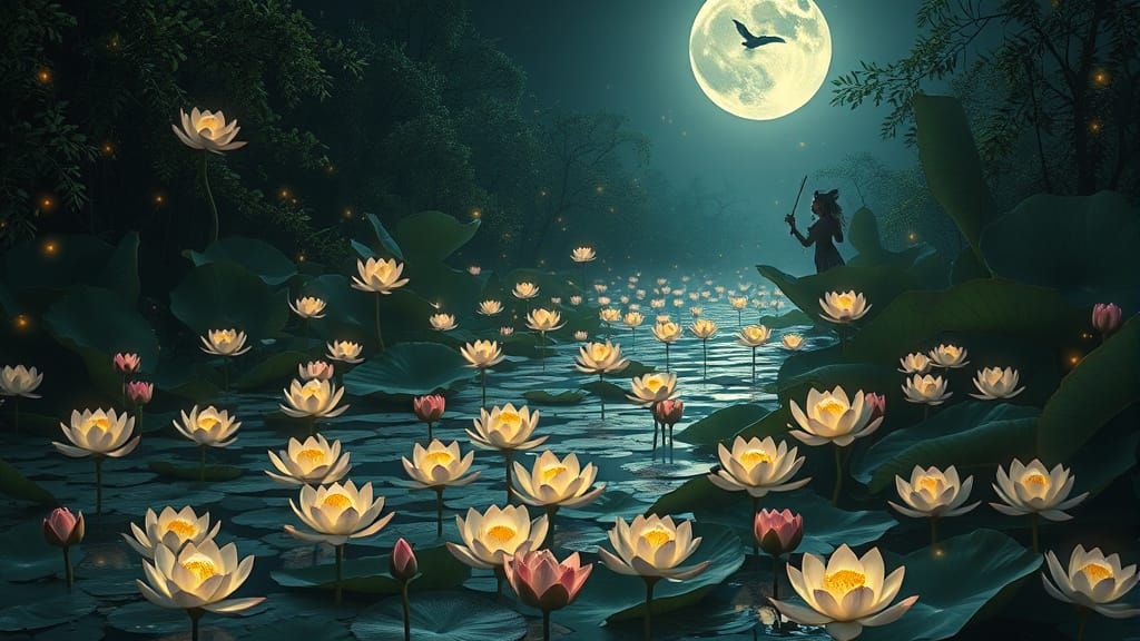 A tranquil pond scene at night with countless lotus blossoms illuminated by the moon. An elf plays a flute amid fireflies, rendered with dramatic lighting and iridescent colors in an Art Deco style.