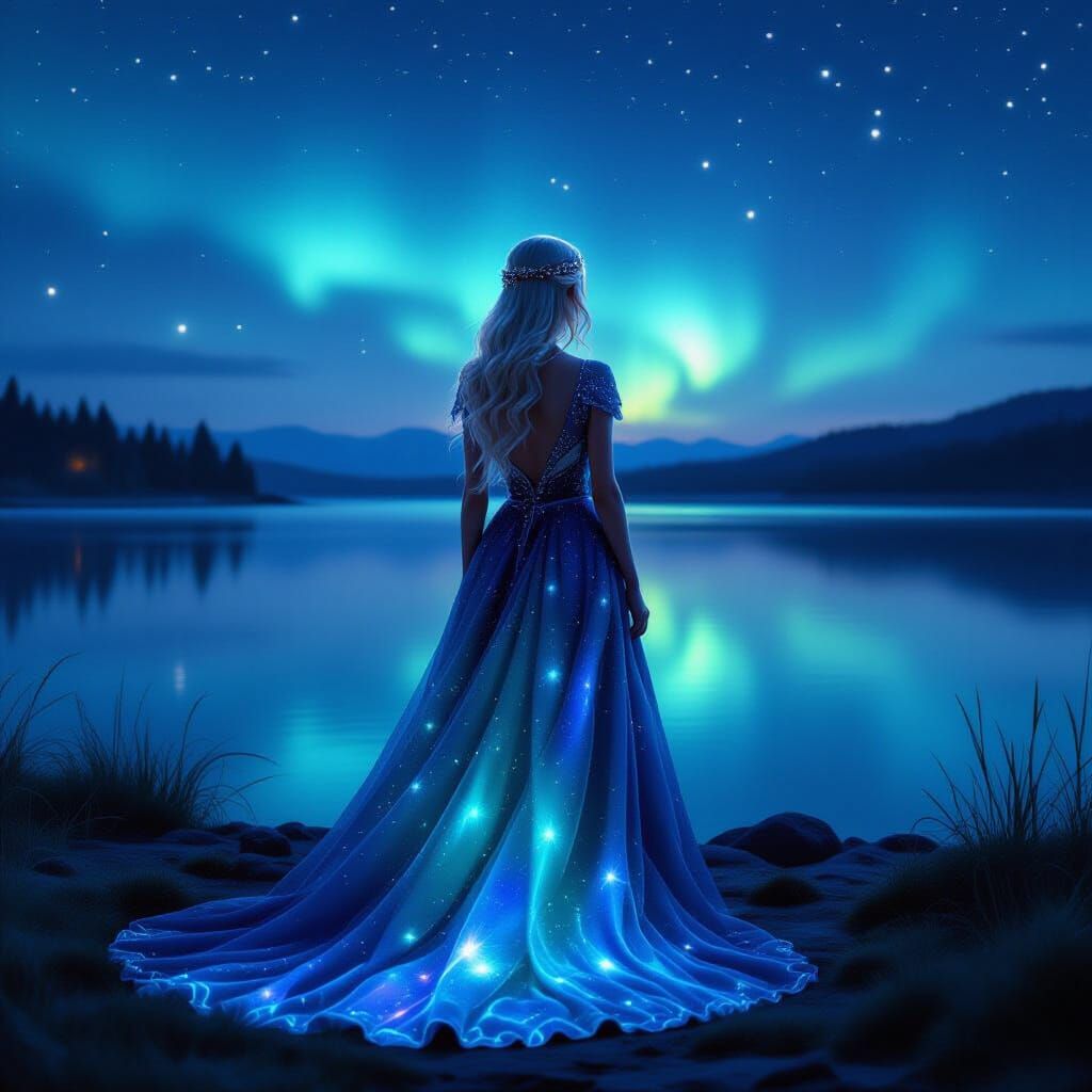 This image shows an elf with hair the color of the aurora borealis, wearing a starry dress with a train. She is realistically rendered and gazing at a lake at night.