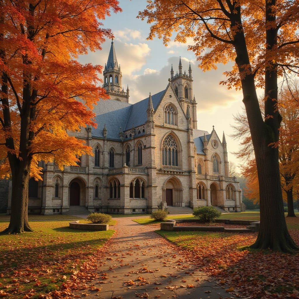 A majestic cathedral bathed in the warm, golden light of autumn, with intricate stone carvings and stained glass windows that evoke a sense of awe and wonder, as if the spirit of the season has been captured within its ancient walls.