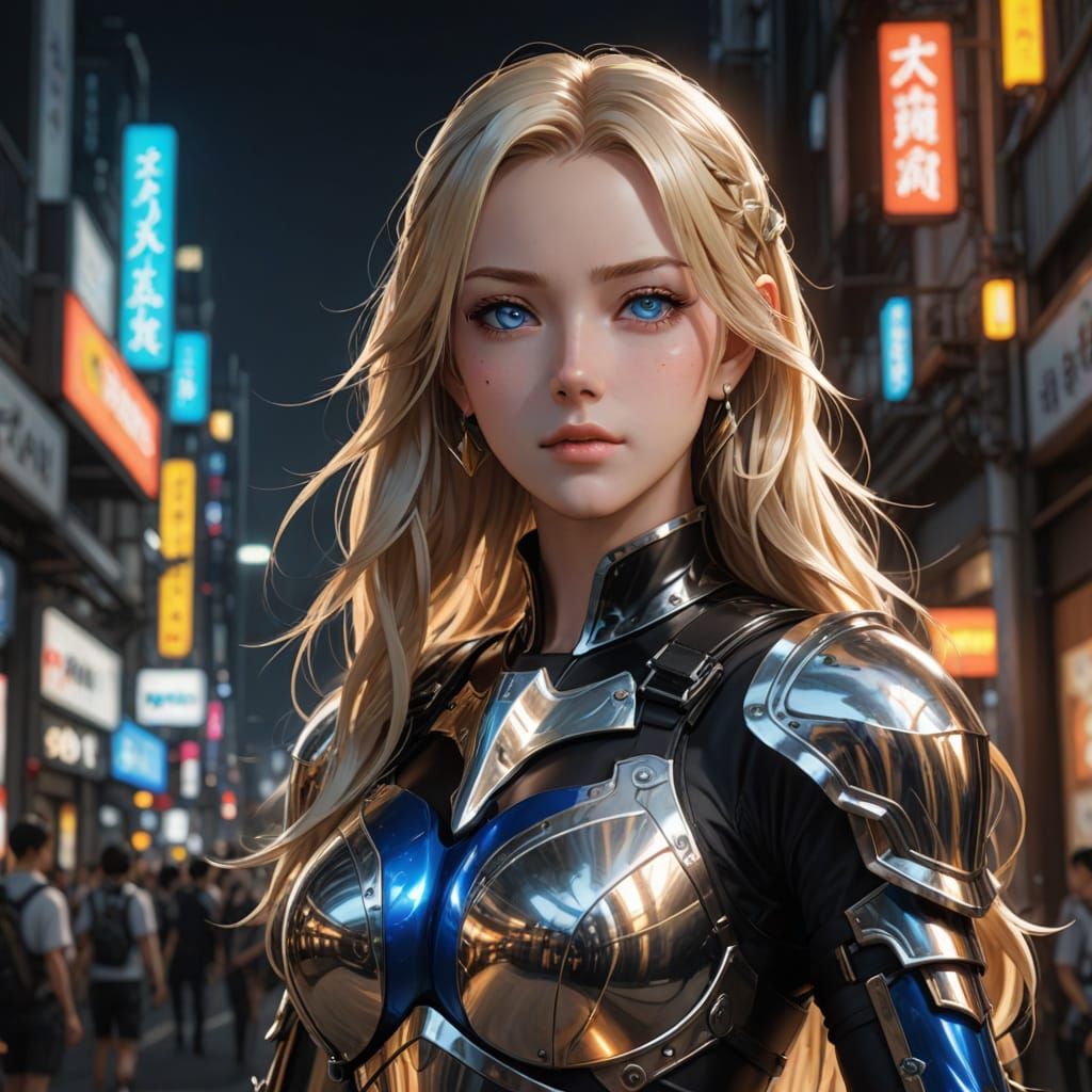 This image shows a full body shot of a beautiful blonde anime woman posing in black and white armor. The digital art features glossy metallic accents, dramatic lighting, and vibrant colors.