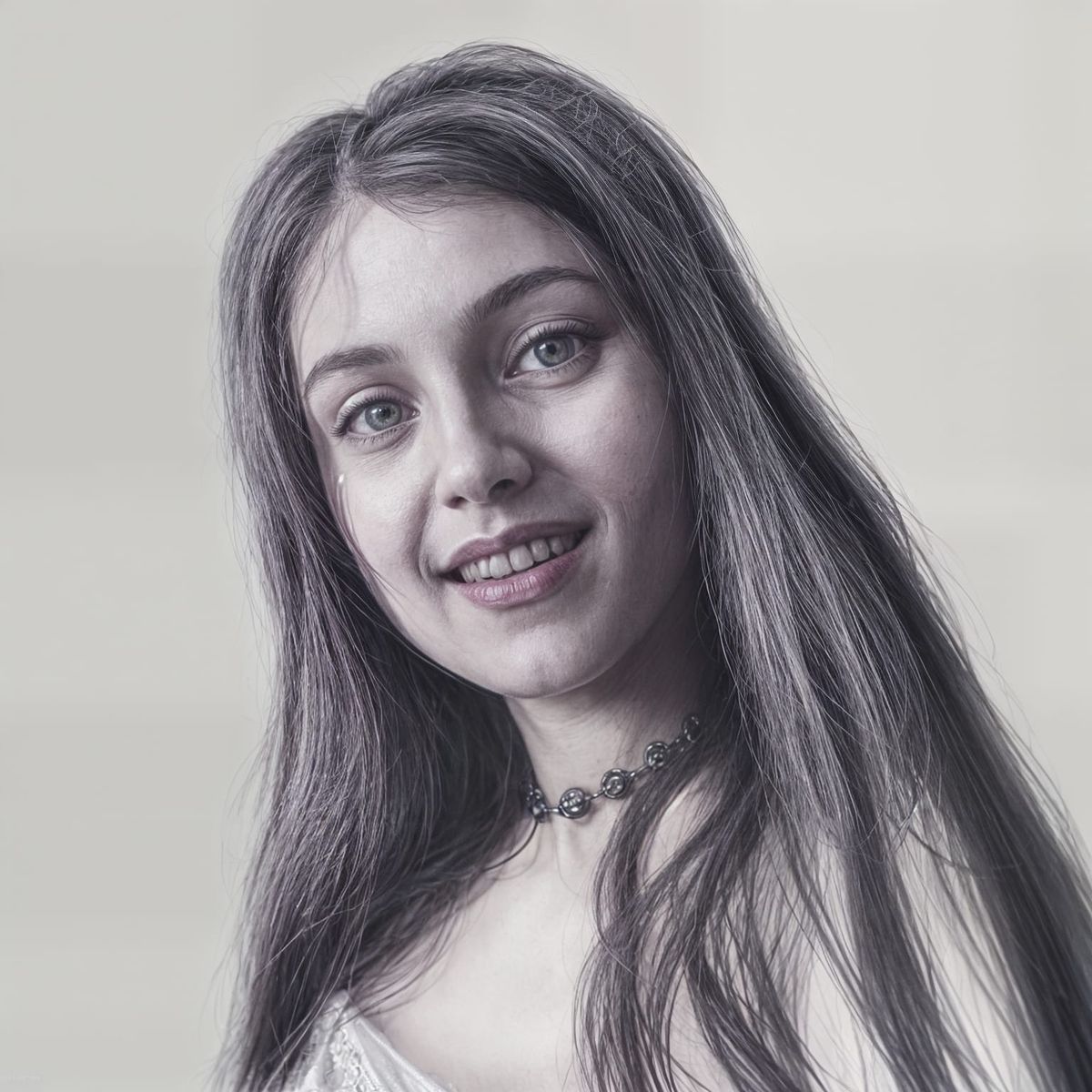 This image is a haunting depiction of a mysterious woman, shrouded in an eerie atmosphere with muted colors and soft focus. A subtle noctilucent glow illuminates her face, set against a darkened background with bold lines and woodcut textures.
