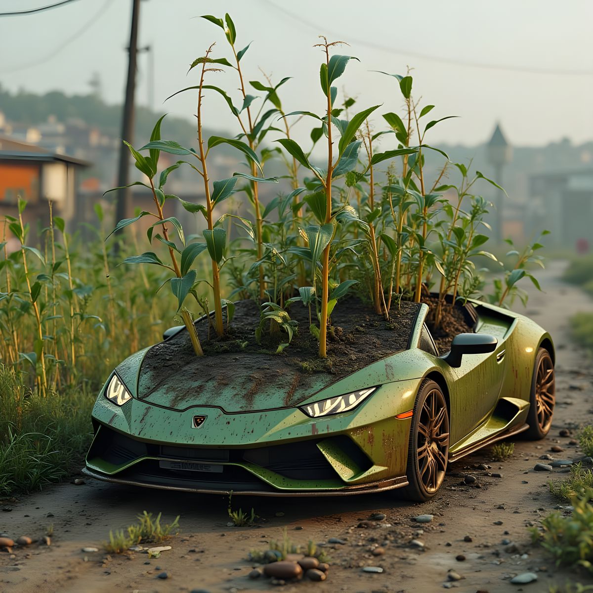 This hyperdetailed image shows corn stalks emerging from an open Lamborghini engine bay, viewed from the front of the exotic sports car.