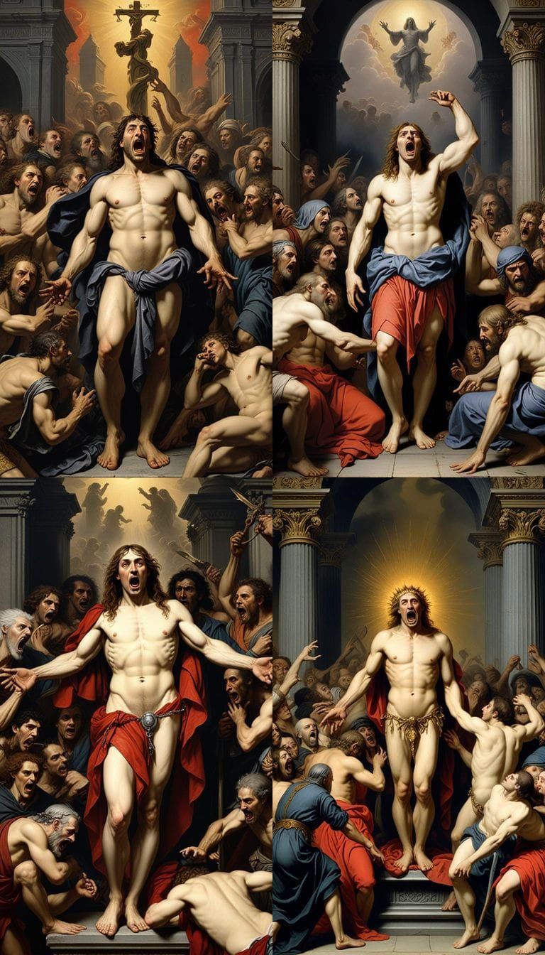 This striking image captures a sermon drenched in violence and pain, rendered in a style reminiscent of Renaissance and Gothic art with dramatic, expressive brushwork.