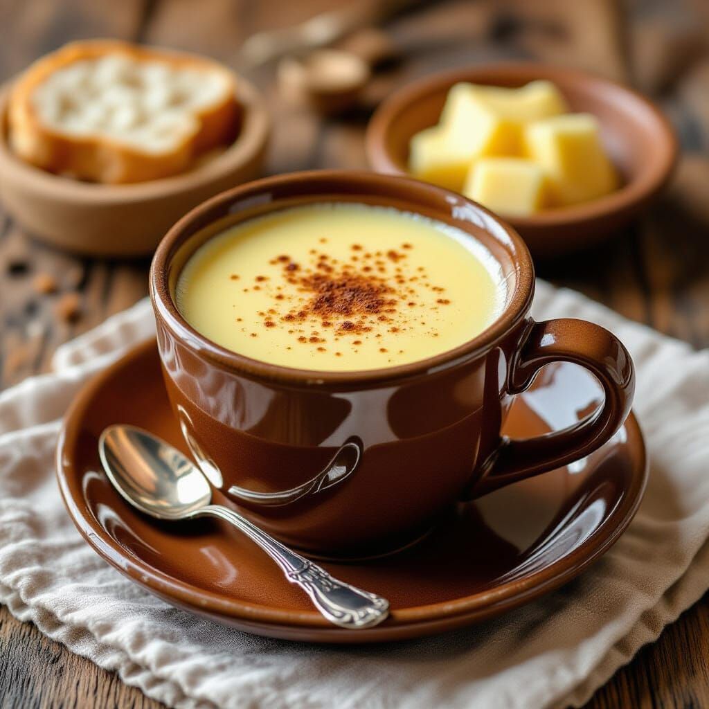 This image shows a 'sobado pasiego', a traditional Cantabrian dessert, served in a rustic ceramic bowl. The artwork evokes the soft brushstrokes and warm colors of Spanish Impressionism.